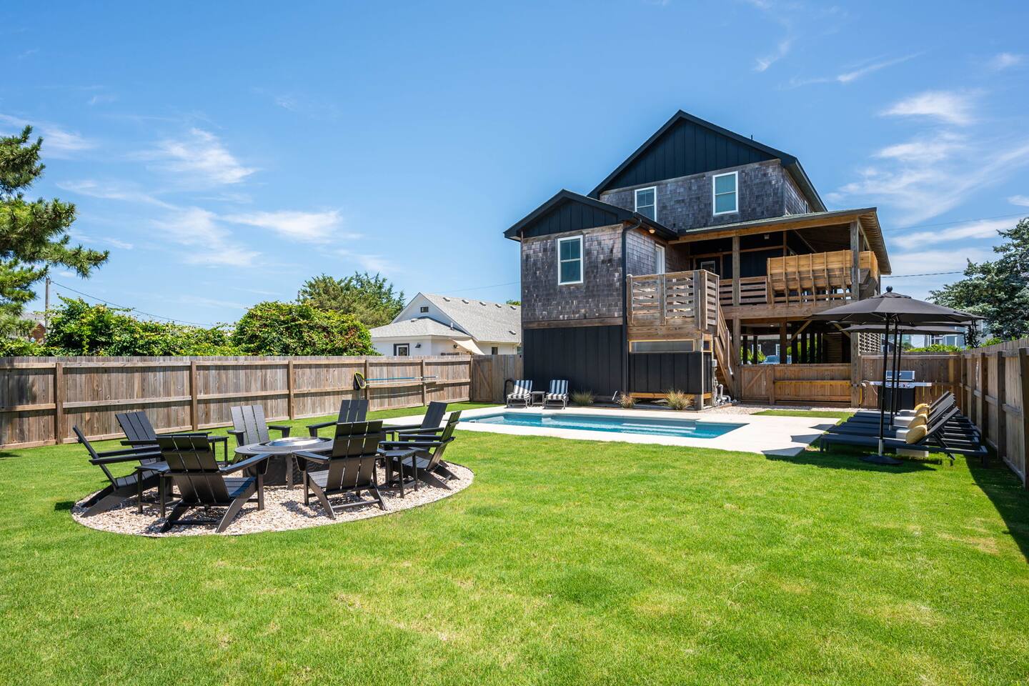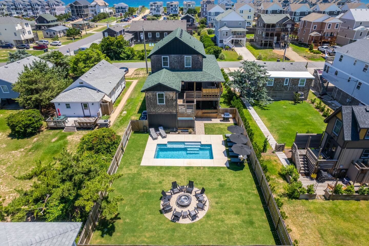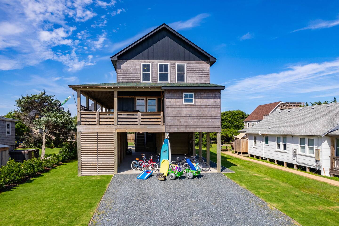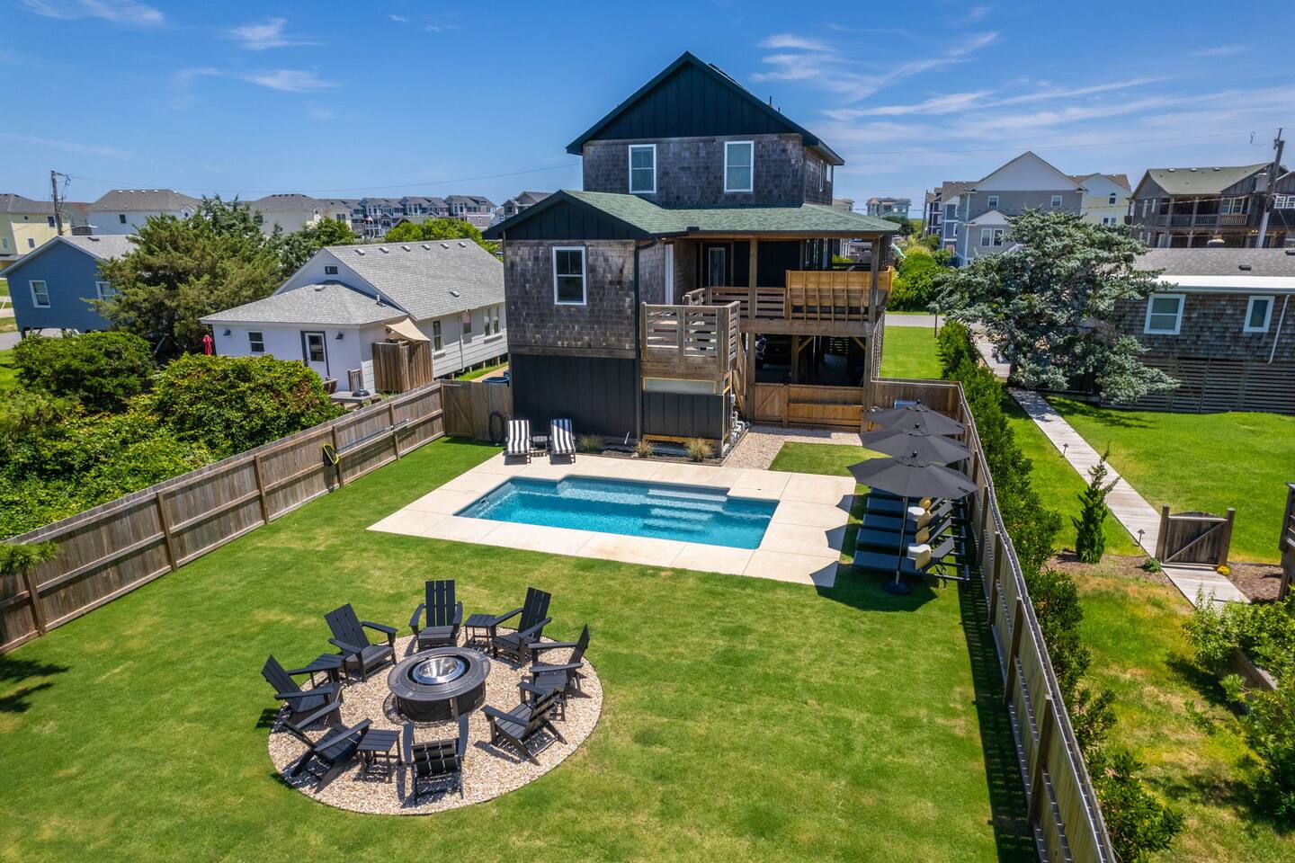 Top floor has 3 bedrooms and 2 bathrooms. - 1 king bed with en suite primary bathroom w/shower - 1 king bed - 2 sets of double bunks (twin over twin) - main bathroom with tub/shower combo Mid level floor - Living room with 85 inch tv - Dining table can accommodate 8 guests comfortably - Additional seating outdoors and at kitchen island - 4th bedroom with king bed and en suite bathroom. Has private access off the kitchen back door that we call our "mother in-law" suite. Also has a mini fridge and microwave. - Washer and dryer Ground level - Heated pool (Pool heat is free - no additional charge) - Hot tub - Fully fenced backyard - Beach gear and beach cruiser bikes - Chairs and umbrellas - Wood burning fire pit (firewood provided) - Gas grill - Outdoor shower We supply: - Bed linens and bath towels - Beach towels - 8 beach chairs and umbrellas for you to use - Cooler - Beach cart that rolls on sand