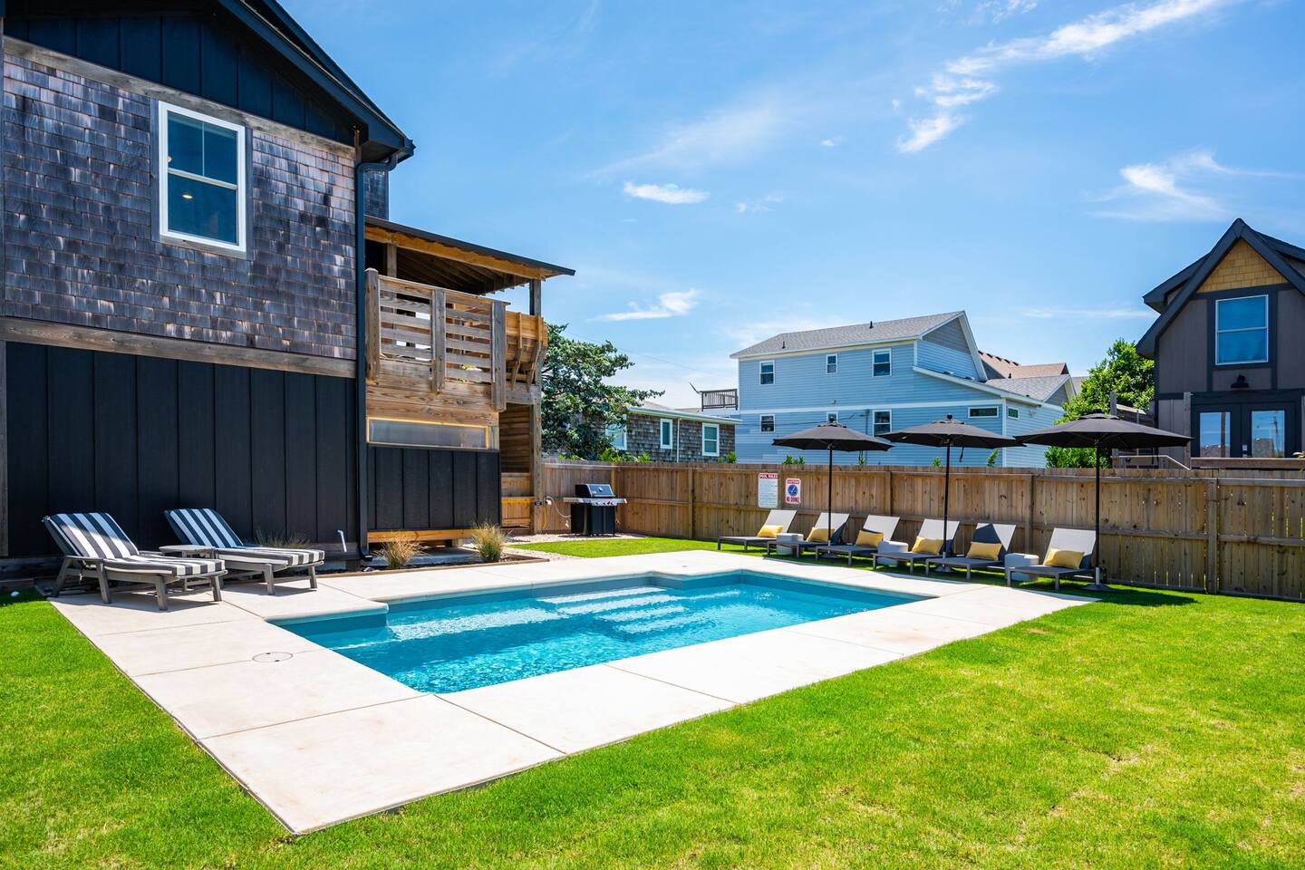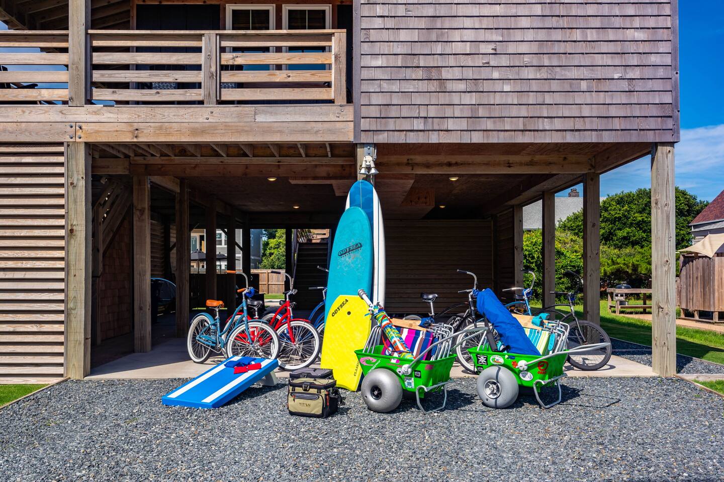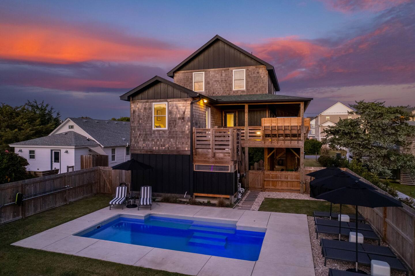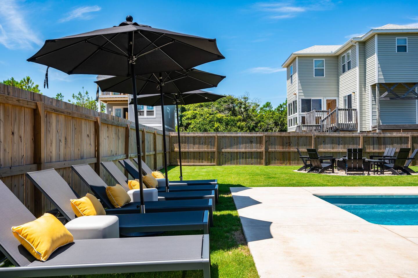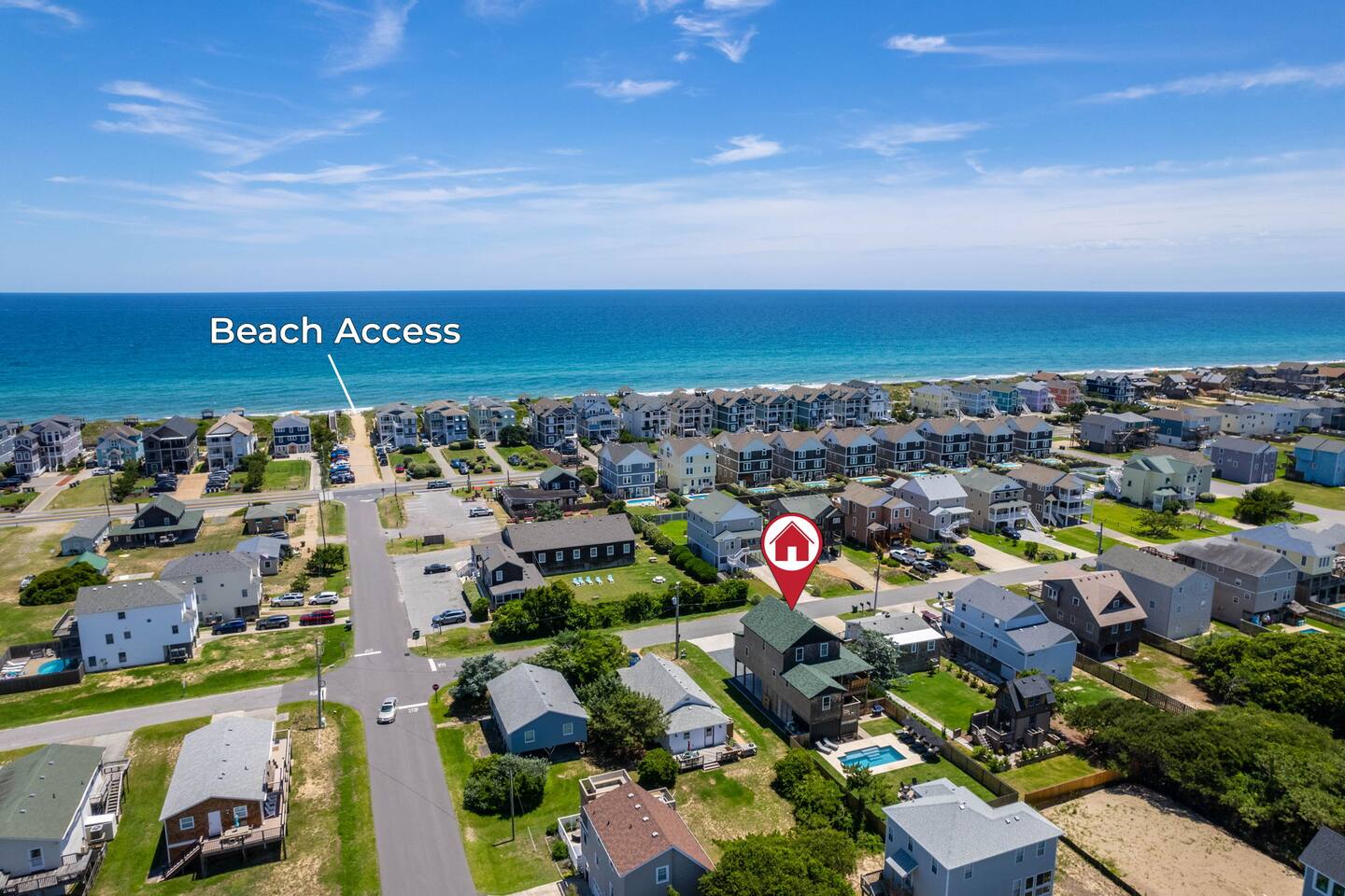 Top floor has 3 bedrooms and 2 bathrooms. - 1 king bed with en suite primary bathroom w/shower - 1 king bed - 2 sets of double bunks (twin over twin) - main bathroom with tub/shower combo Mid level floor - Living room with 85 inch tv - Dining table can accommodate 8 guests comfortably - Additional seating outdoors and at kitchen island - 4th bedroom with king bed and en suite bathroom. Has private access off the kitchen back door that we call our "mother in-law" suite. Also has a mini fridge and microwave. - Washer and dryer Ground level - Heated pool (Pool heat is free - no additional charge) - Hot tub - Fully fenced backyard - Beach gear and beach cruiser bikes - Chairs and umbrellas - Wood burning fire pit (firewood provided) - Gas grill - Outdoor shower We supply: - Bed linens and bath towels - Beach towels - 8 beach chairs and umbrellas for you to use - Cooler - Beach cart that rolls on sand