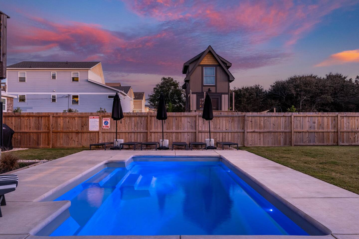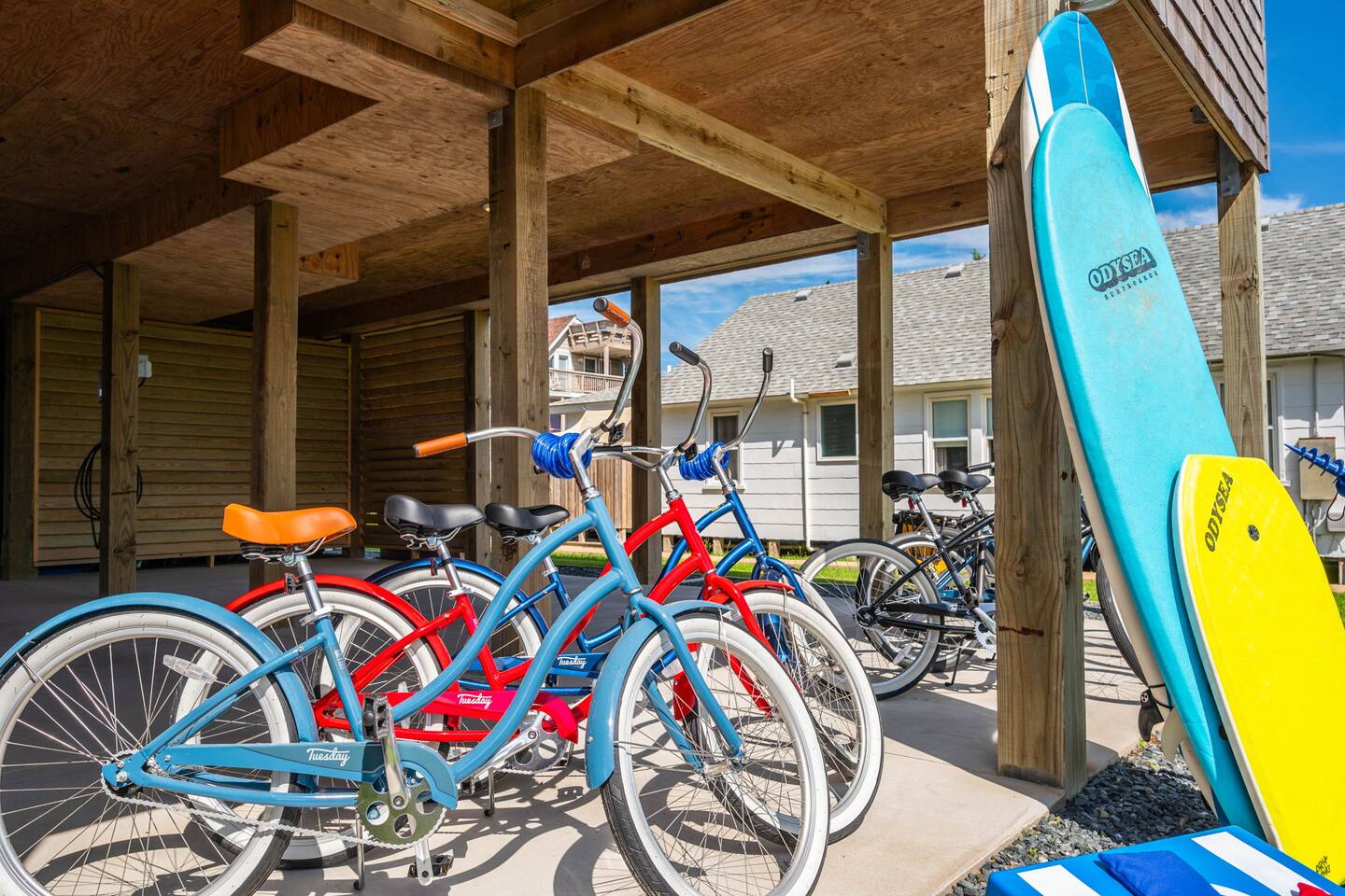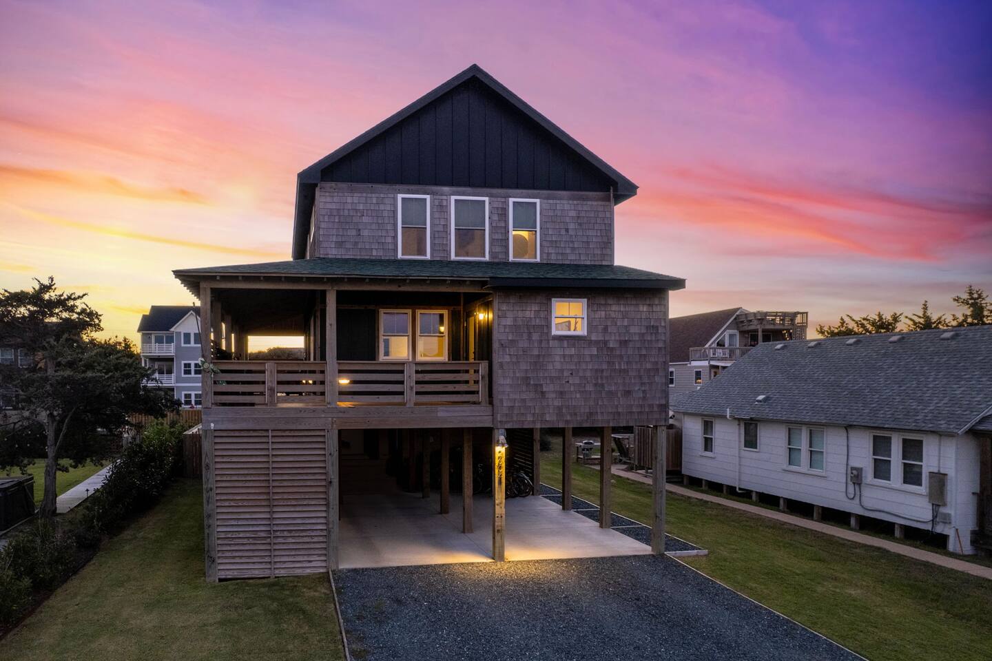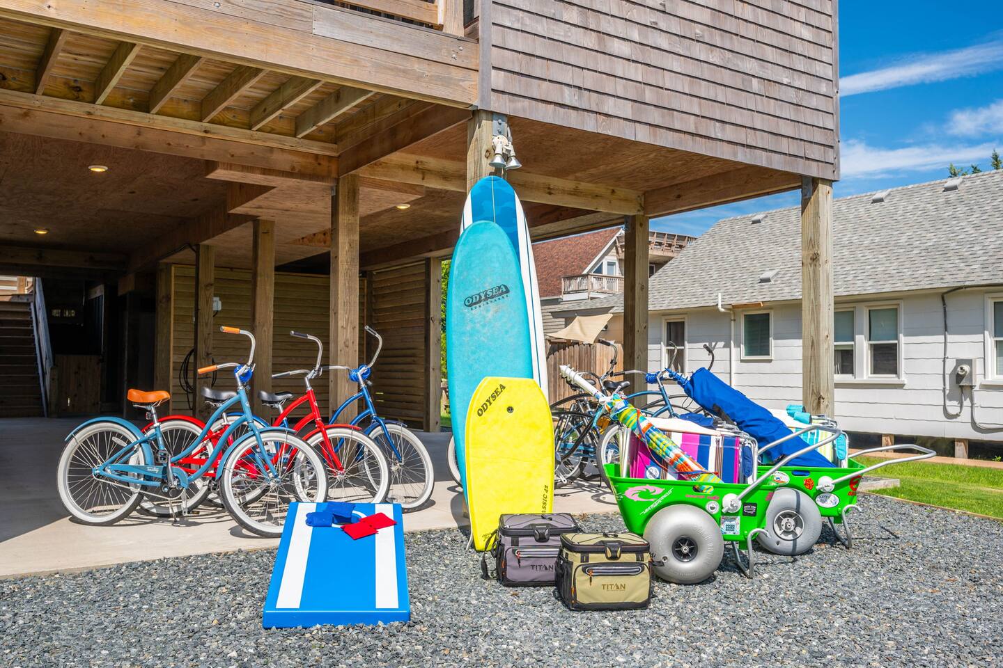 Top floor has 3 bedrooms and 2 bathrooms. - 1 king bed with en suite primary bathroom w/shower - 1 king bed - 2 sets of double bunks (twin over twin) - main bathroom with tub/shower combo Mid level floor - Living room with 85 inch tv - Dining table can accommodate 8 guests comfortably - Additional seating outdoors and at kitchen island - 4th bedroom with king bed and en suite bathroom. Has private access off the kitchen back door that we call our "mother in-law" suite. Also has a mini fridge and microwave. - Washer and dryer Ground level - Heated pool (Pool heat is free - no additional charge) - Hot tub - Fully fenced backyard - Beach gear and beach cruiser bikes - Chairs and umbrellas - Wood burning fire pit (firewood provided) - Gas grill - Outdoor shower We supply: - Bed linens and bath towels - Beach towels - 8 beach chairs and umbrellas for you to use - Cooler - Beach cart that rolls on sand