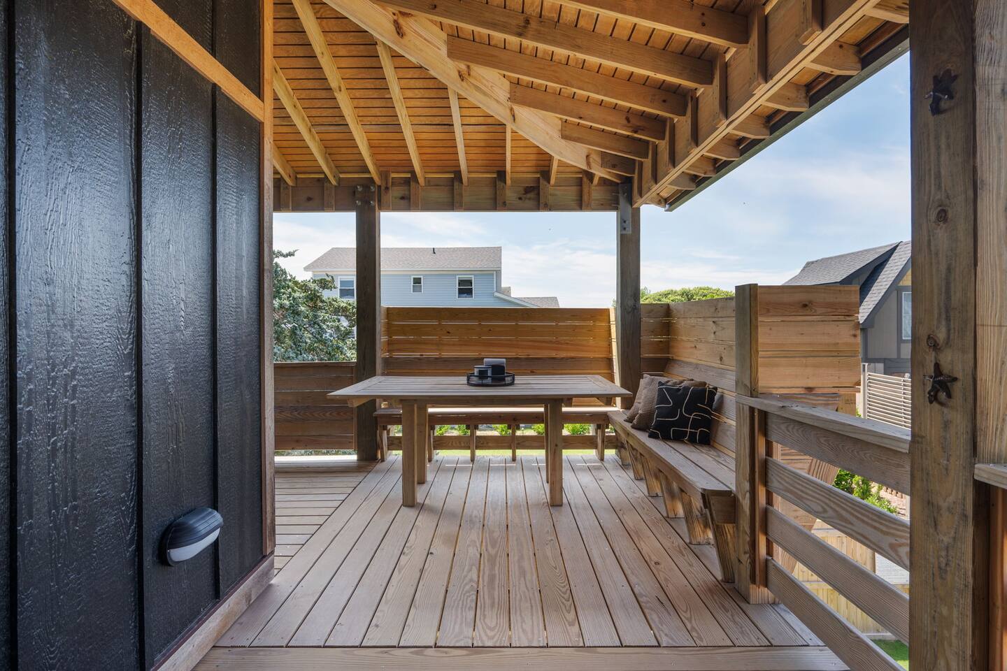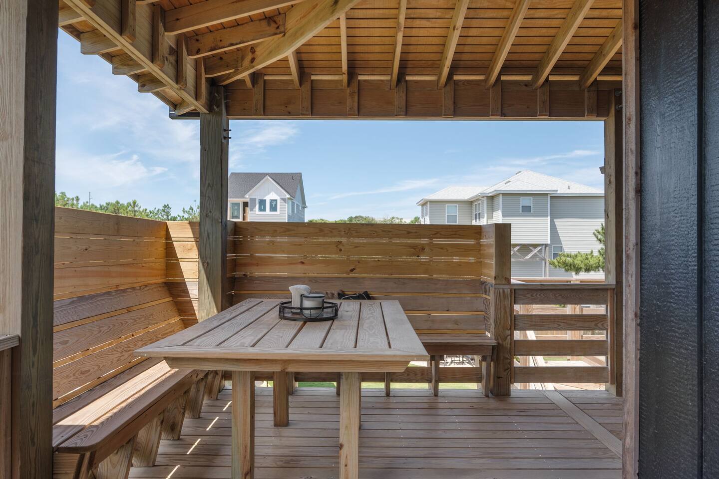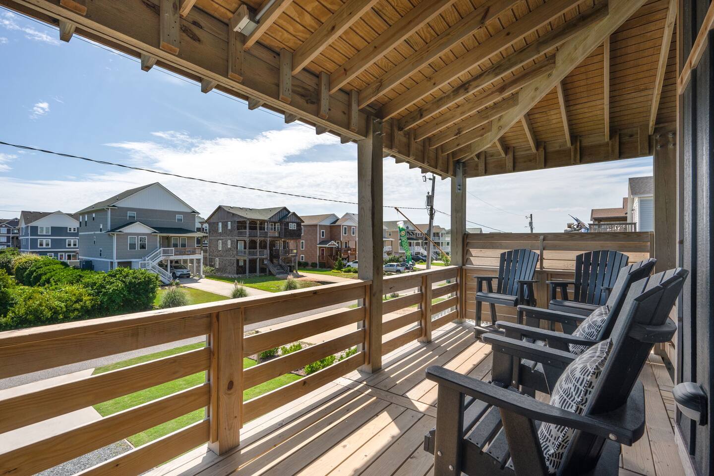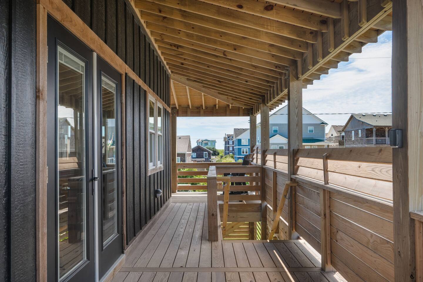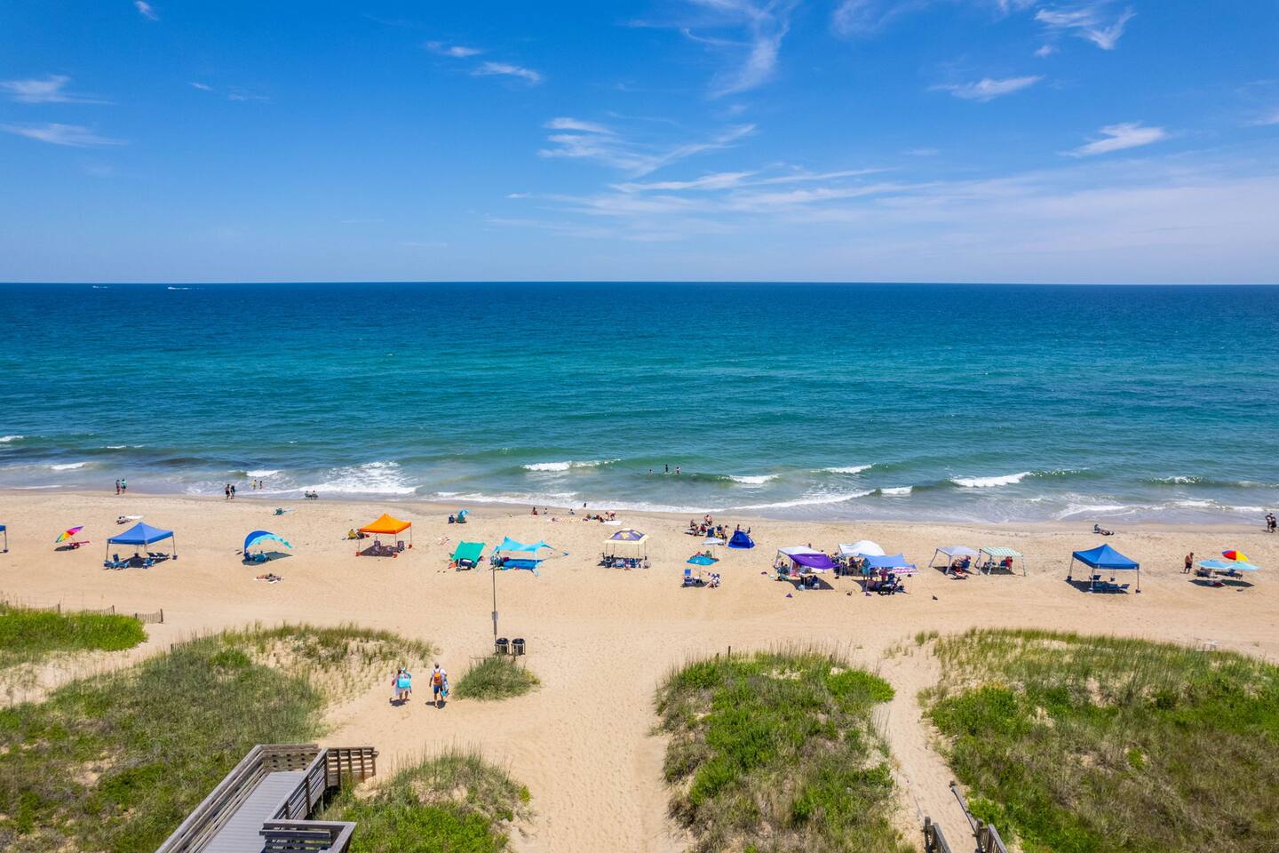 Top floor has 3 bedrooms and 2 bathrooms. - 1 king bed with en suite primary bathroom w/shower - 1 king bed - 2 sets of double bunks (twin over twin) - main bathroom with tub/shower combo Mid level floor - Living room with 85 inch tv - Dining table can accommodate 8 guests comfortably - Additional seating outdoors and at kitchen island - 4th bedroom with king bed and en suite bathroom. Has private access off the kitchen back door that we call our "mother in-law" suite. Also has a mini fridge and microwave. - Washer and dryer Ground level - Heated pool (Pool heat is free - no additional charge) - Hot tub - Fully fenced backyard - Beach gear and beach cruiser bikes - Chairs and umbrellas - Wood burning fire pit (firewood provided) - Gas grill - Outdoor shower We supply: - Bed linens and bath towels - Beach towels - 8 beach chairs and umbrellas for you to use - Cooler - Beach cart that rolls on sand