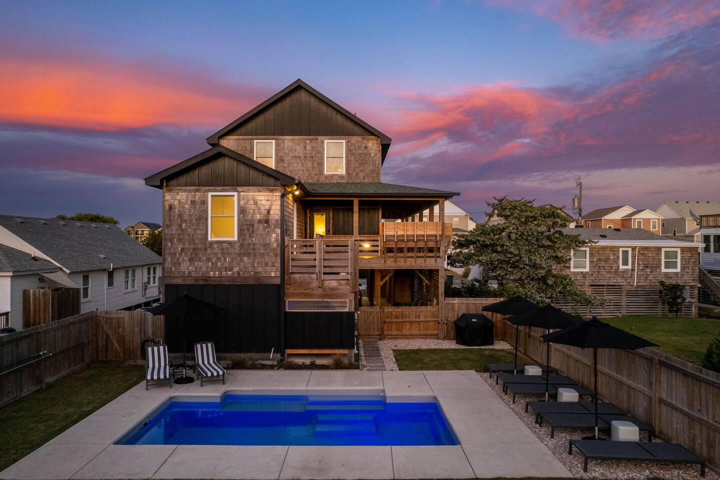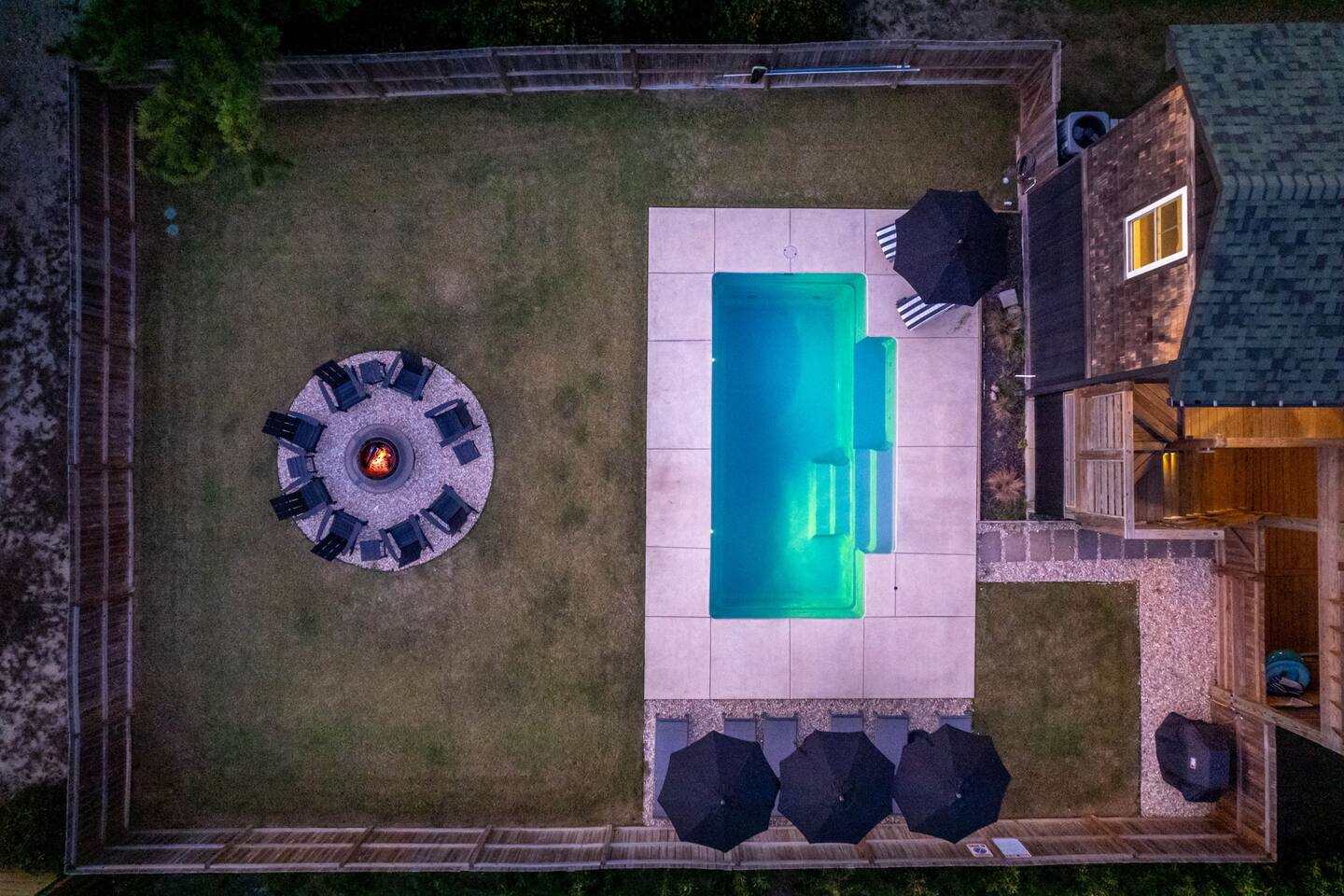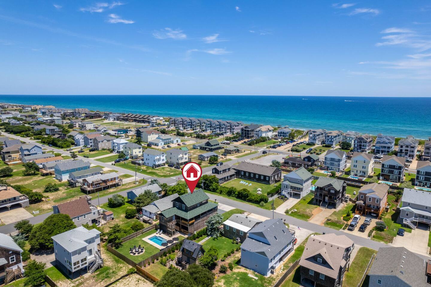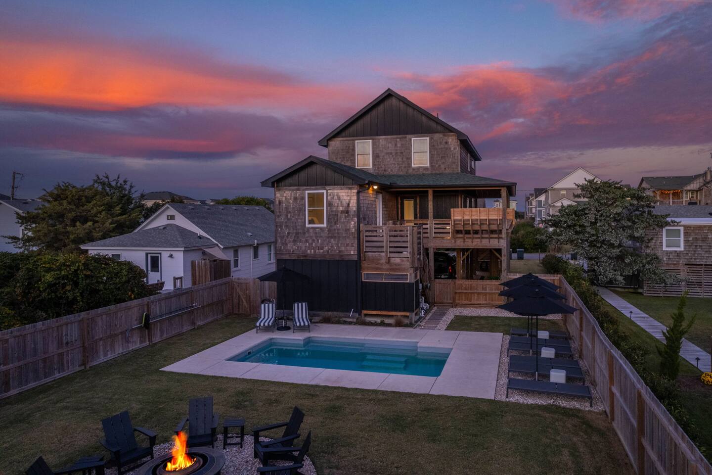 🍂 Fall in Nags Head is peaceful & inviting at this clean, new 4BR beach retreat. The "Shorebreak" house is just steps from shops, surfing & a short walk to the beach. You’ll enjoy crisp air, golden sunsets & quiet shores. Sip morning coffee on the deck, soak year-round in the private hot tub, or swim in the heated (free heat) saltwater pool Apr-Nov. Evenings call for cozy fireside chats under the stars. A fenced yard adds comfort & privacy for families, friends, or a romantic getaway.
