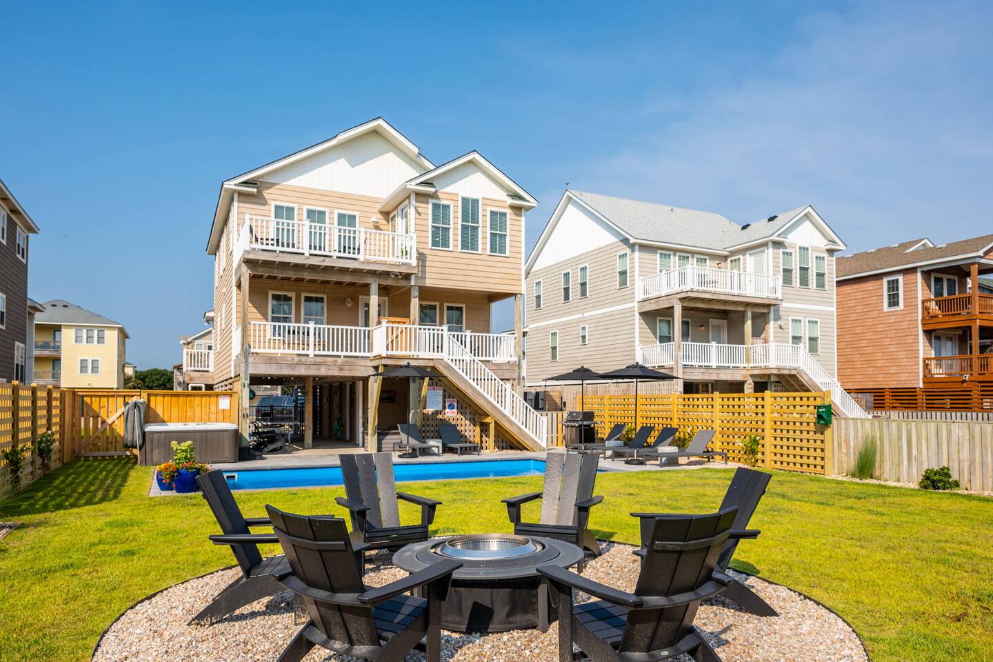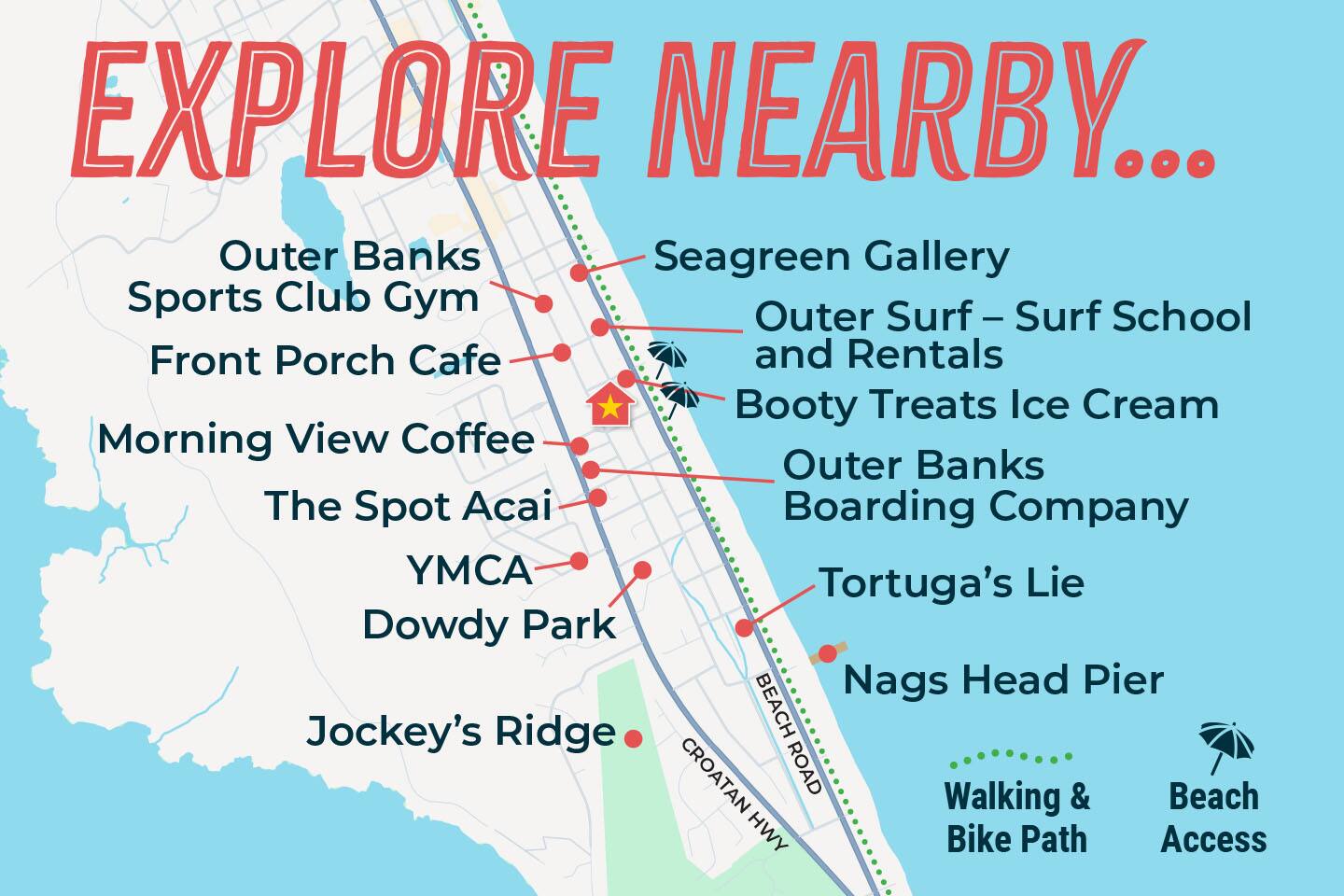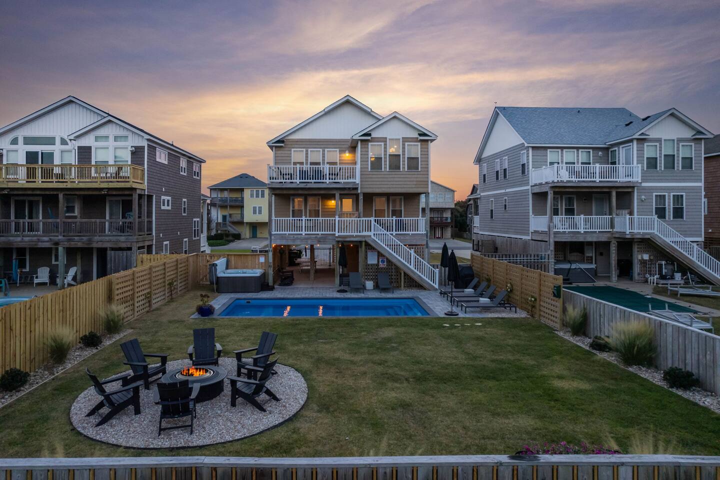 "Aprés Sea" is a 4 bedroom, 3.5 bath home great for up to 11 guests, with ample space inside and multiple outdoor spaces to relax. Bedroom configurations: - 1 king bed - 1 king bed - 1 king bed - 2 bunk sets (total 4 twin beds) - 1 twin xl bed in small nook bonus room (best suited for children). Other features include: - Heated saltwater pool (open April 1 - November 1). Pool heat is free - no additional charge. - Hot tub - Front and back decks with seating - Fully equipped kitchen - Full washer and dryer - Fast Wi-Fi - Smart TVs in every room, with live YouTubeTV - Fenced backyard - Fire pit with smokeless Solo Stove (firewood provided) - Oversized outdoor shower - Beach gear provided - Cruiser bikes - Steps to the beach - Near restaurants and shops - EV charger - 4 burner gas grill What's close by to walk to? - Two great beach accesses - Morning View Coffee & Front Porch Cafe - OBBC & Secret Spot surf shops - Dowdy Park - Outer Surf surf school - The Spot acai & ice cream - Seagreen Gallery - The French Door boutique - OBX Hot Yoga - YMCA & Outer Banks Sports Club gyms - Red Drum Tap & Grill