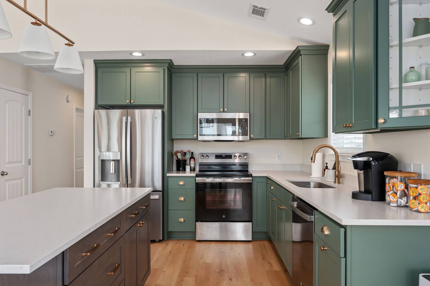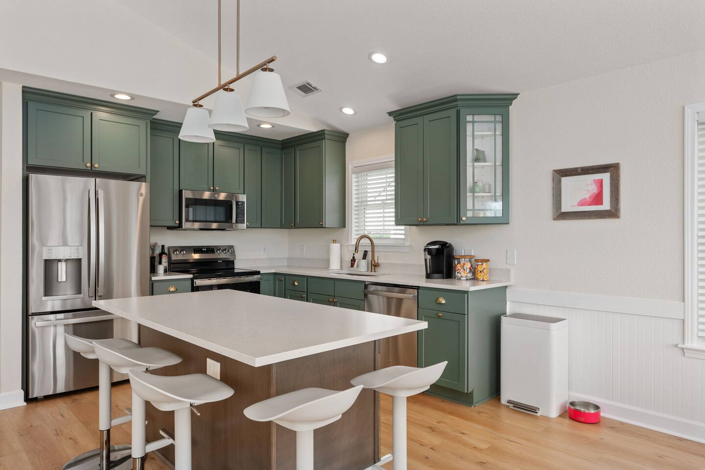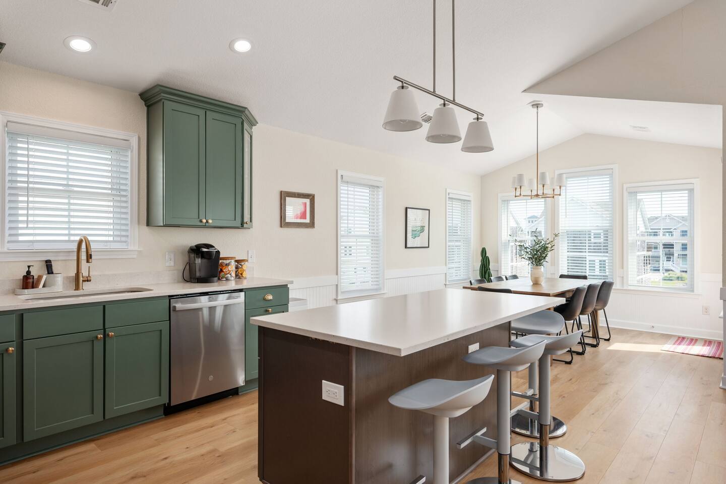 The house can accommodate up to 2 dogs with a non-refundable pet fee. If you have a special request, please reach out to us. The door code is provided at the check-in time on the day of arrival. We provide linens (sheets and bath and beach towels). A booster seat and a pack ‘n play with sheets are also kept at the house. We provide a starter pack with the following: - toilet paper - paper towels - dishwasher tablets - laundry pods - Keurig coffee pods - trash bags