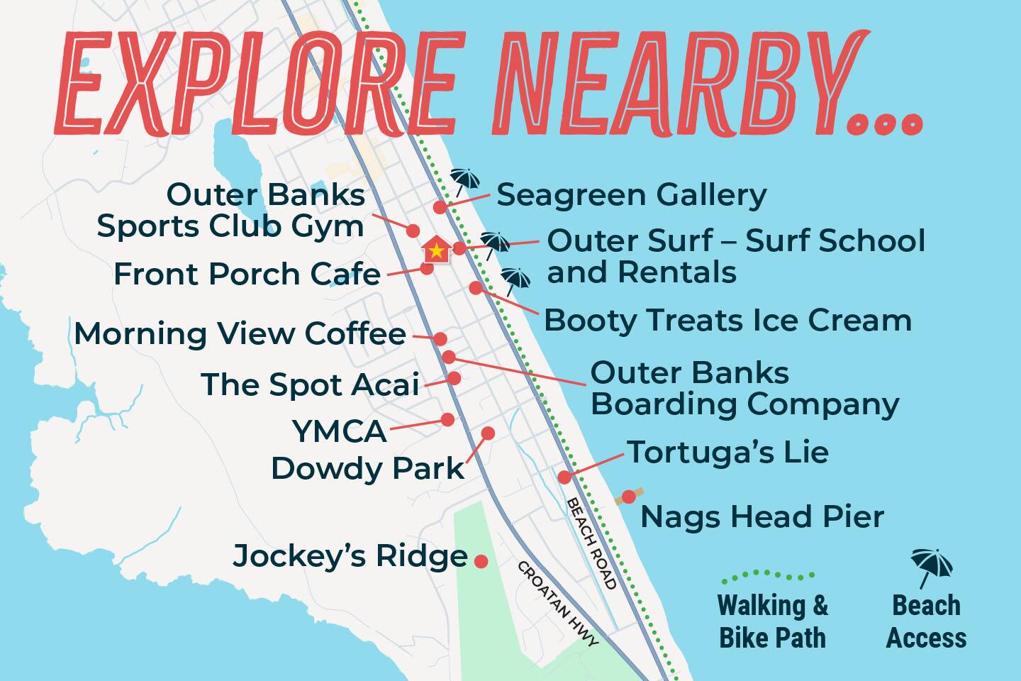 You will appreciate the fantastic location of this beachside house. It's steps from a popular coffee shop, The Front Porch Cafe, as well as near one of the very best beach accesses in Nags Head - Abalone Street. The Outer Surf Shop is at the end of the street and provides surfboard rentals and lessons. The beach access is a favorite because it typically has a sandbar at low tide that keeps the water more shallow than other areas along the oceanfront. You can also take a stroll to the Nags Head pier and comb the beach for shells along the way. Dogs are also allowed on Nags Head beaches year round. Many other shops and dining options are nearby this centrally located beach house.